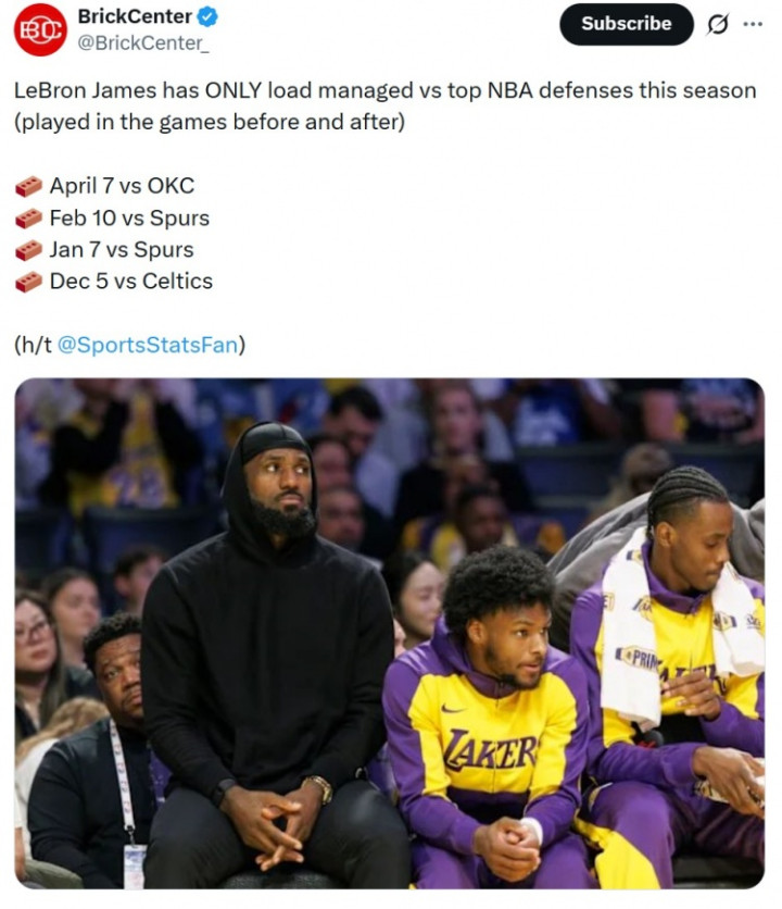 美媒BrickCenter发文称,詹姆斯本赛季仅在对阵顶级防守球队时进行负荷管理(在前后比赛中均有出场),详情如下