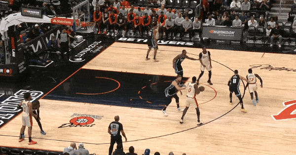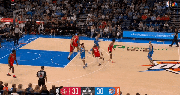 同时,这个战术中雷霆双塔都扮演了非常重要的角色。让切特、哈腾二人都很好的参与到进攻当中的同时,既发挥出了切特作为空间型内线的特殊价值,又能很好的体现哈腾的策应、手递手能力。