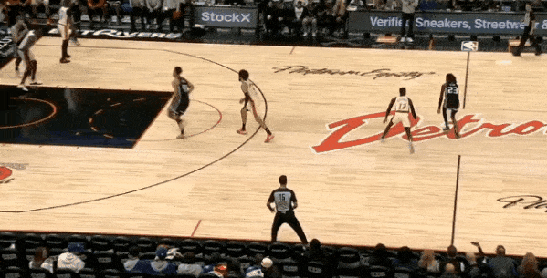 同一场比赛的第一节11:04,活塞再一次发动“Stagger Decoy DHO“,和上面回合同样的“战术起手式”、“战术环节”。这个回合CC借杜伦手递手后,杜伦再转变掩护方向,CC顺势衔接挡拆,用一记中投惩罚小萨的沉退。