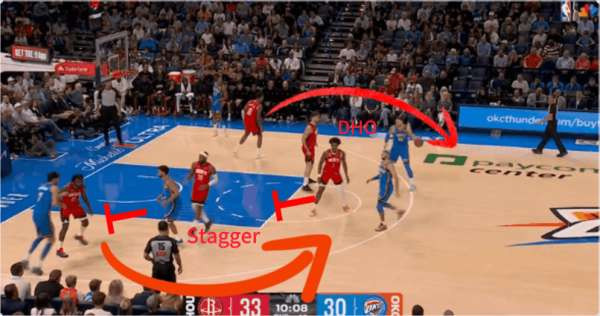 用我自己的理解翻译成中文应该是:以梯次掩护(Stagger)为“诱饵”(Decoy)的手递手(DHO)进攻。