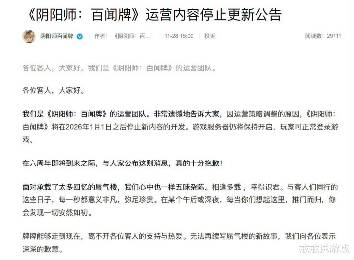 《阴阳师:百闻牌》作为网易旗下阴阳师IP的卡牌衍生作品,自上线以来就以其精美的和风画面、独特的卡牌机制和浓郁的阴阳师世界观吸引了一批忠实玩家。如今,官方一纸公告宣告了游戏内容更新的终结。从2026年1月1日起,这款游戏将不再有新式神、新卡牌或新玩法模式的加入。游戏圈内人常开玩笑说,判断一个游戏是否还活着,就看它还有没有更新。按照这个标准,百闻牌算是进入了“半退休”状态。不过比起那些直接关服停运的游戏,百闻牌的做法算是相当体面。它让人想起那些宣布退休但依然每天出现在公园遛弯的老先生,生活节奏慢了,但生活还在继续。