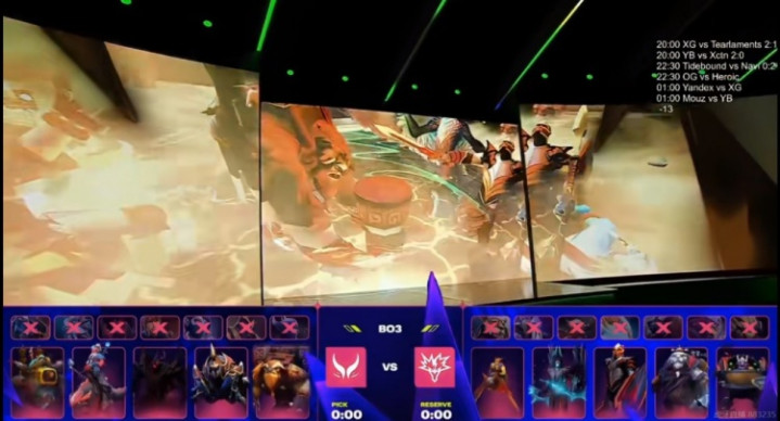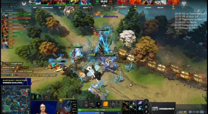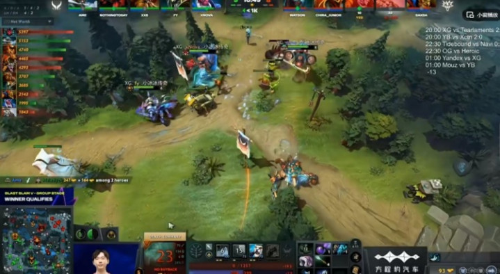 天辉XG:Ame矮人直升机、xNova萨尔、NothingToSay影魔、Fy司夜刺客、Xxs撼地者